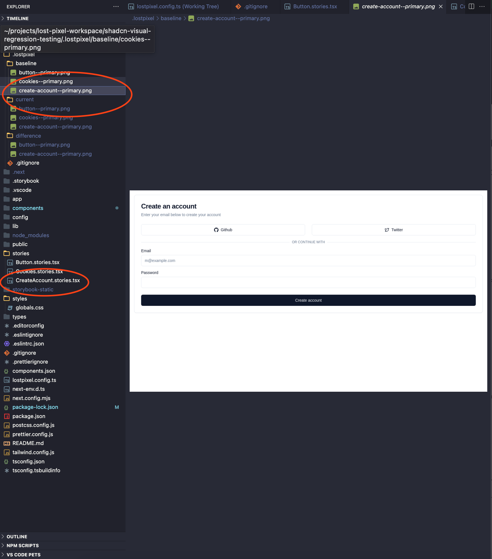 We can see that in both of the pattern components that were using the <Button/> with primary variant we have the spotted regressions. All the relevant to the run images are saved in .lost-pixel folder.